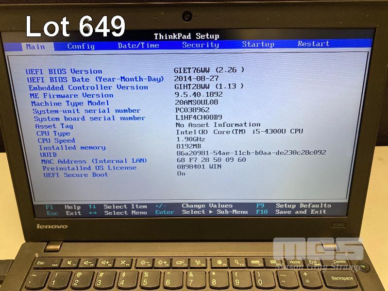 LAPTOP, LENOVO THINKPAD X240 (20AMS0UL08), CORE i5 4300U (4TH GEN) @ 1.9GHz, 8GB DDR3 RAM, 160GB SATA HDD, 12.5" WIDESCREEN (1366x768), INTEL HD VIDEO, Wi-Fi, BLUETOOTH, WINDOWS 10 PRO INSTALLED & POWER SUPPLY (NOTE: NO BATTERY, WHITE SPOT SCREEN BLEMISHES, CRACK LINE ON CASING) S/N:PC038962