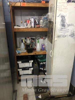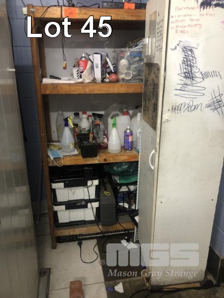 4 TIER TIMBER RACK & SINGLE DOOR CUPBOARD & CONTENTS VARIOUS CLEANING PRODUCTS, CABLES, TOOLS, MOP & GLOBES