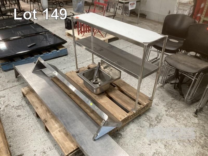 2 x STAINLESS STEEL WALL SHELVES, 245 & 152cm, OVERSHELF, 120cm & HAND BASIN