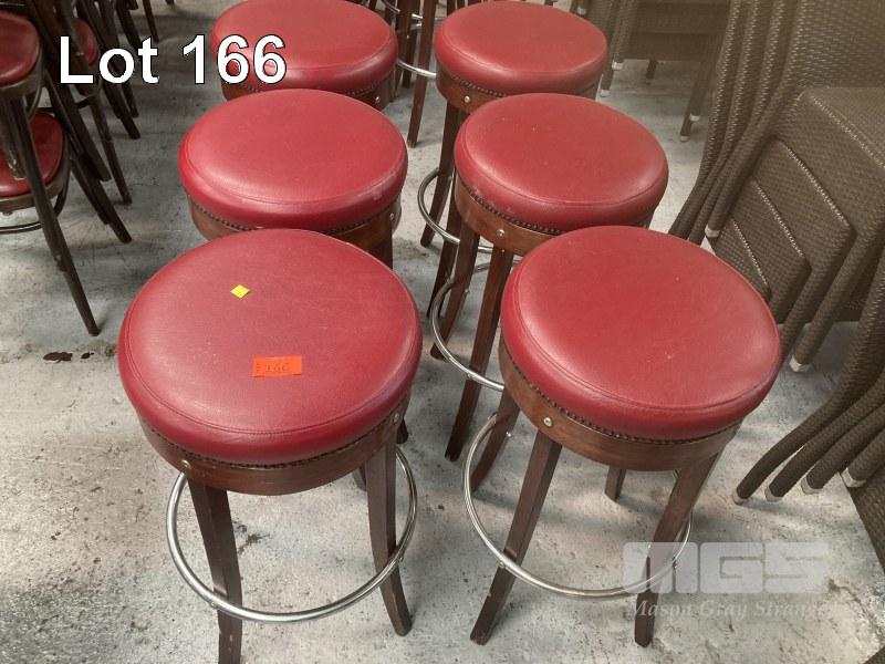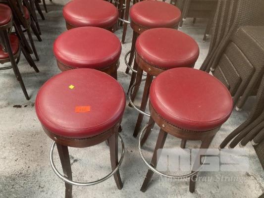 6 x BAR STOOLS, TIMBER FRAME, RED VINYL PADDED SEAT
