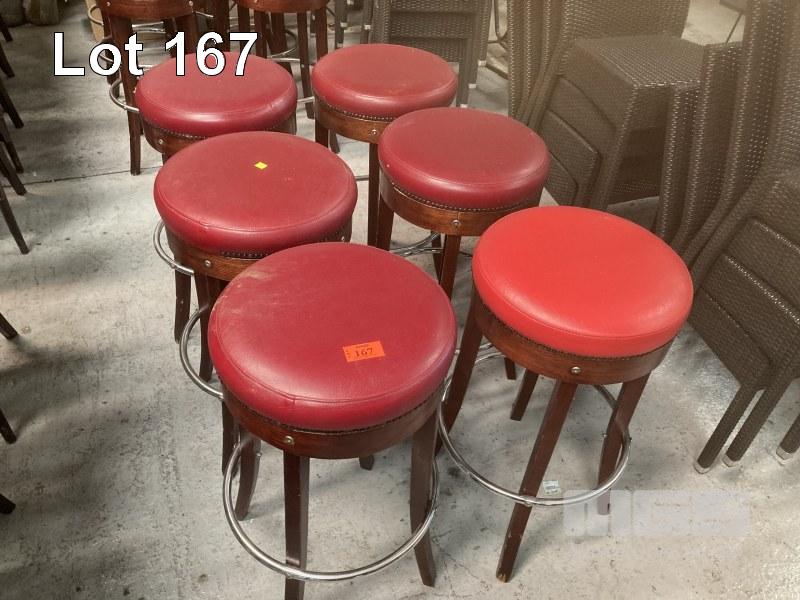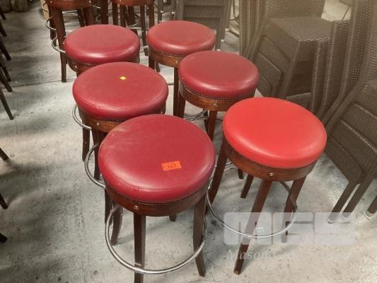6 x BAR STOOLS, TIMBER FRAME, RED VINYL PADDED SEAT