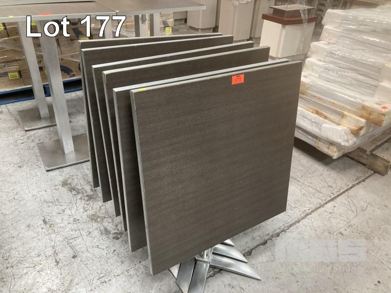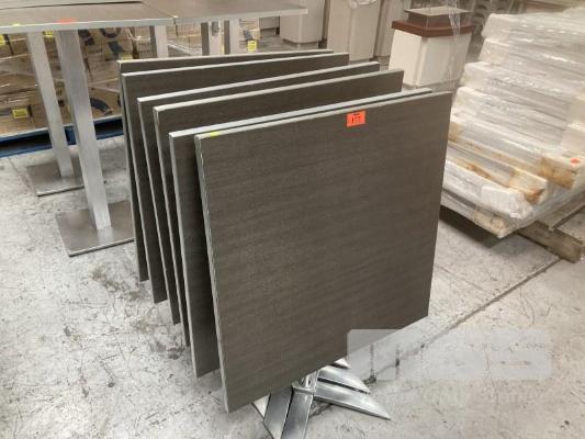 6 x FOLD DOWN CAFE TABLES, 70 x 70cm, GREY LAMINATE (1 WITH DAMAGED BASE)