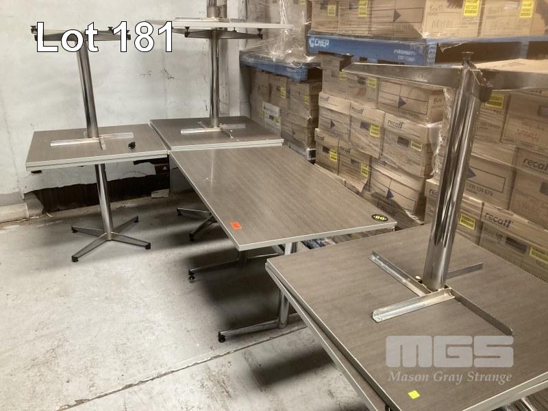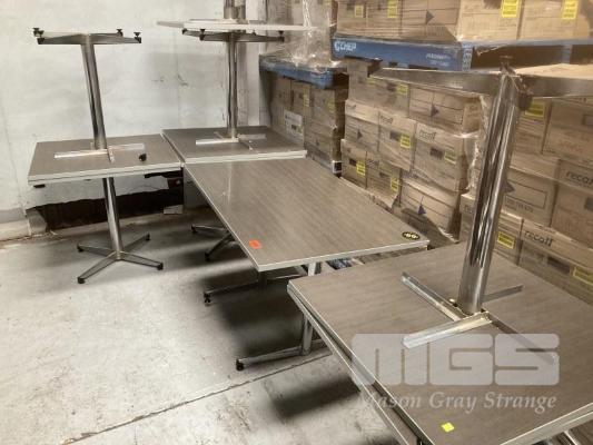 8 x CAFE TABLES, 7 @ 80 x 80cm & 1 @ 120 x 80cm, GREY OAK LAMINATE