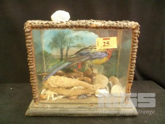 TAXIDERMY COMPOSITION, ROSELLA IN GLASS CASE WITH SPONGES AND CORALS