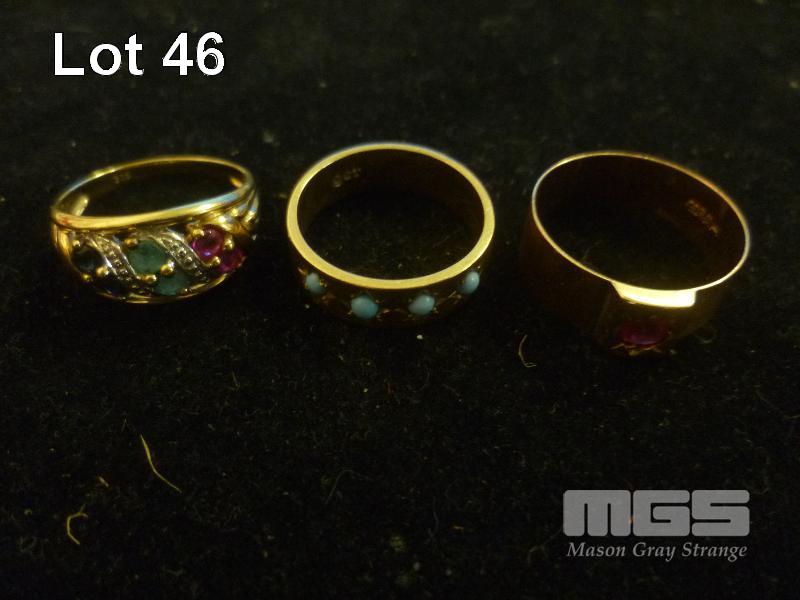3 X GOLD RINGS, 9 CT, 1 X WITH PAIRS OF BLUE, RED & GREEN STONES, 1 X WITH 4 X TURQUISE STONES, 1 X WITH RED STONE SETTING, 9 GRAMS TOTAL