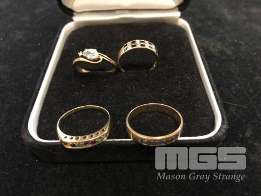 4 X GOLD RINGS, 9 CT, 1 X WITH PAIRS OF BLUE, RED & GREEN STONES, 1 X WITH 10 X BLUE STONES, 1 X WITH 3 X BLUE STONES 1 X AQUA STONE SETTING, 7.5 GRAMS TOTAL