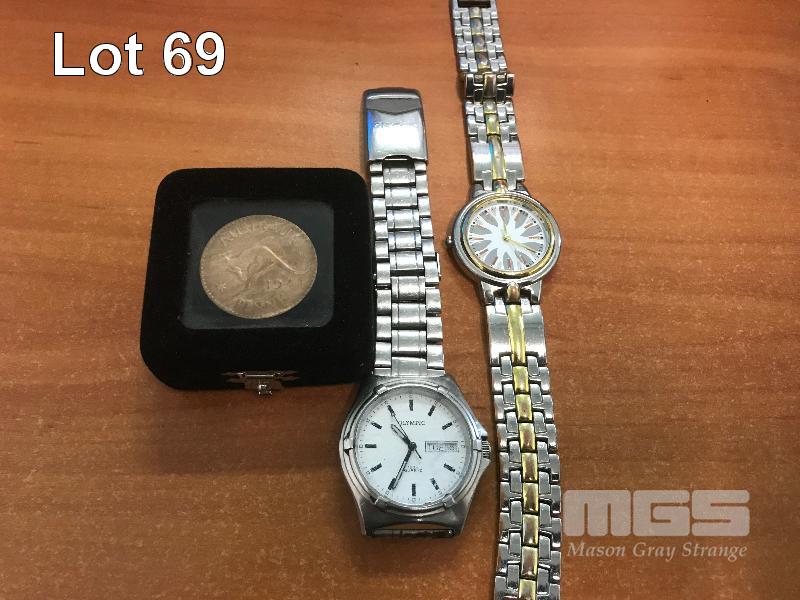 AUSTRALIAN 1941 PENNY IN DISPLAY BOX, 2 X GENTS WRISTWATCHES, 1 X OLYMPIC 1 X NO BRAND