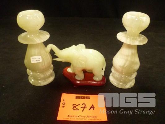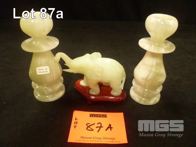 GLASS ELEPHANT AND 2 x TURNED ALABASTER PIECES.