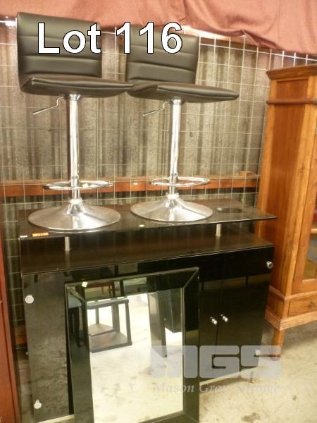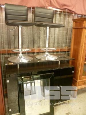 BLACK TIMBER LAMINATE SIDEBOARD, 4 x GLAZED DOORS, GLASS TOP SHELF, 121cm (L), PAIR ADJUSTABLE BAR STOOLS, BLACK VINYL, CHROME BASE & BLACK GLOSS FRAMED WALL MIRROR