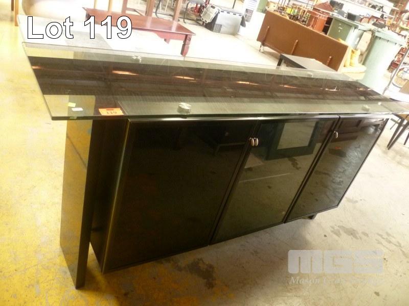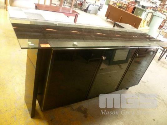 BLACK ENTERTAINMENT UNIT, BLACK GLASS SIDE PANELS, 3 x GLASS DOORS, GLASS TOP, 185cm (L)