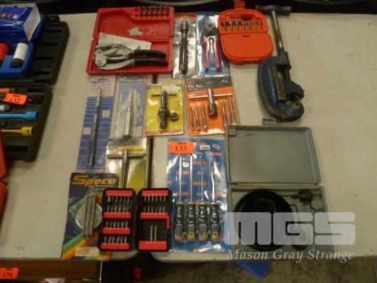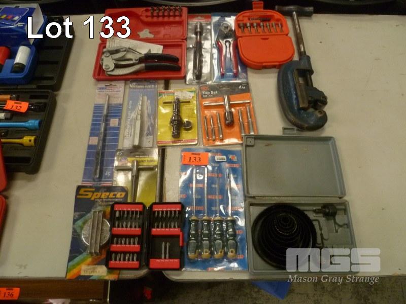 ASSORTED HAND TOOLS INC PIPE CUTTER, HAND PUNCH, TAP SETS, ETC