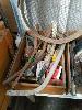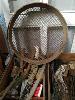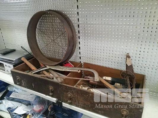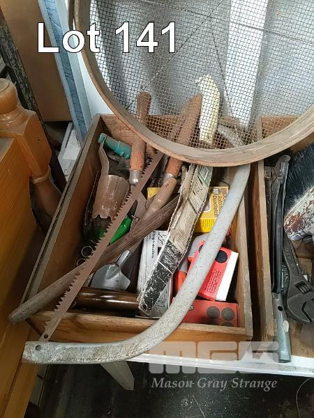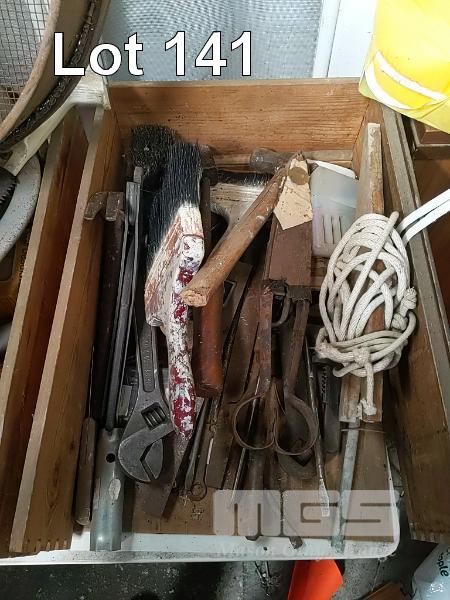 COLLECTION OF ASSORTED VINTAGE AND CONTEMPORARY TOOLS & GARDEN IMPLEMENTS INCLUDING "UTS No. 1" HAND SHEARS , VINTAGE SIEVE PAN, SHIFTERS, HAMMERS, LOCKS, HAND SAWS ETC