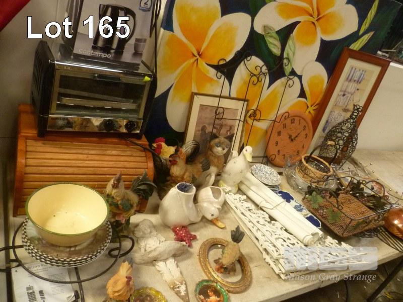 ASSORTED KITCHENWARE INC TOASTER OVEN, KETTLE, ORNAMENTS, BOWLS, ETC, 1 x TABLE