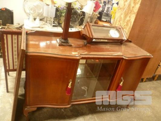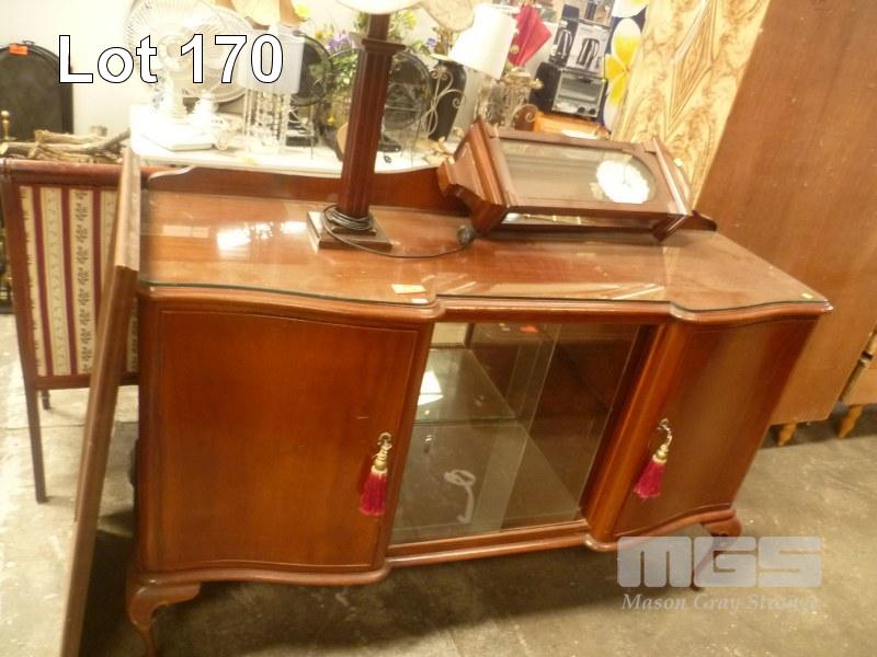 MAHOGANY SIDEBOARD, GLASS SHELF, MIRROR BACK WITH WALL CLOCK & TABLE LAMP