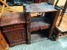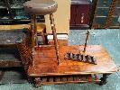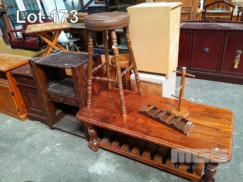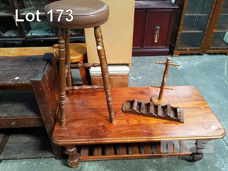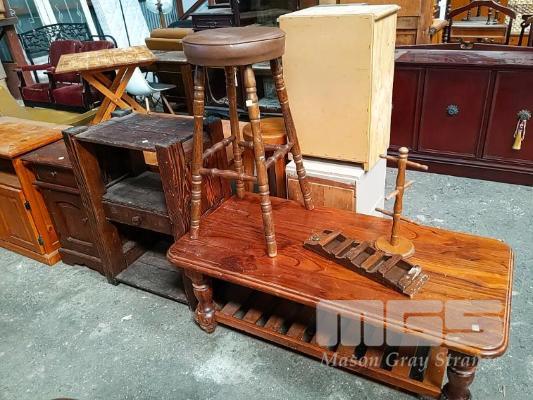 STAINED WOODEN FURNITURE INCLUDING COFFEE TABLE, BAR STOOL, SIDE TABLE, RUSTIC ENTERTAINMENT UNIT ETC
