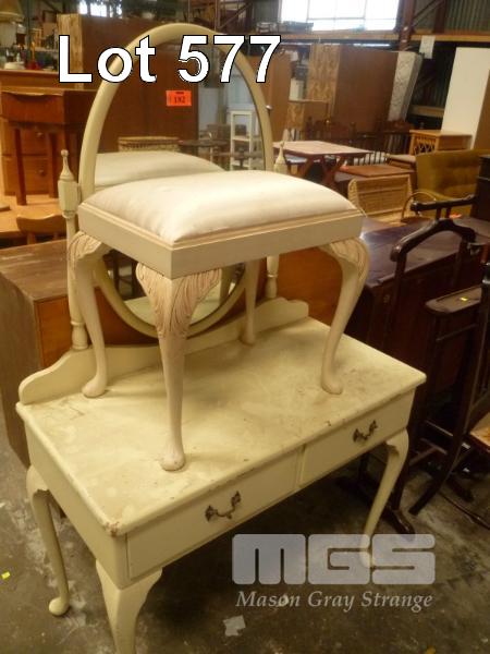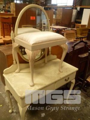 QUEEN ANNE STYLE WHITE DRESSER, OVAL MIRROR & SEAT