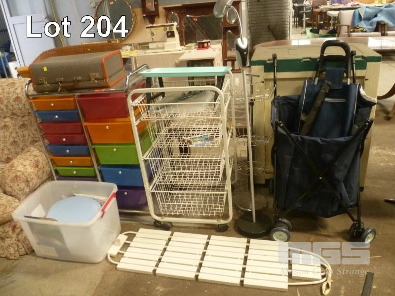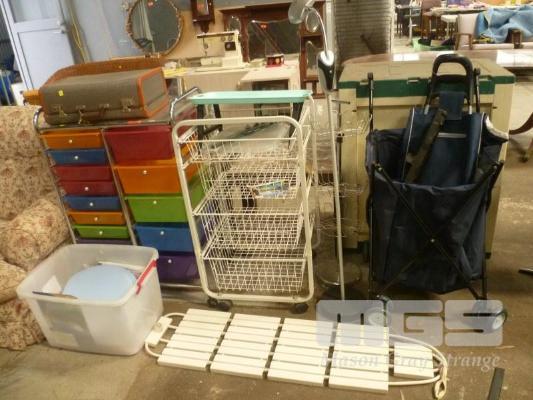 2 x MOBILE DRAWER UNITS, SHOPPING TROLLEY, ETC