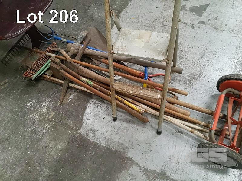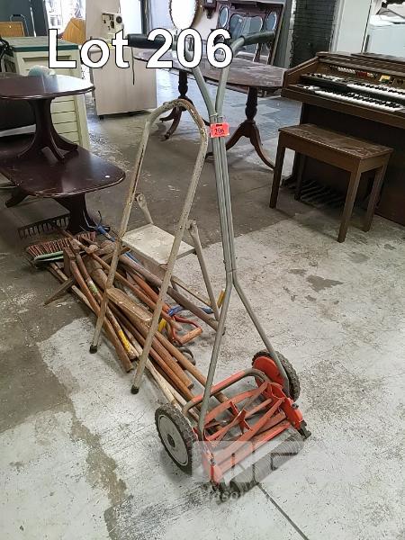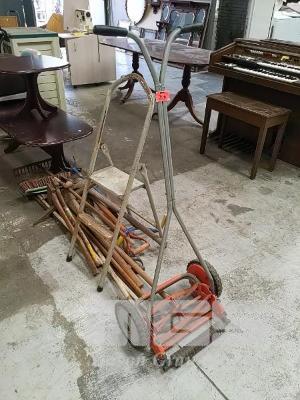 PUSH LAWN MOWER, STEP LADDER, AXES, PICKAXE, POINT PICK, SHOVEL, WOOD SPLITTER AND OTHER GARDEN IMPLEMENTS