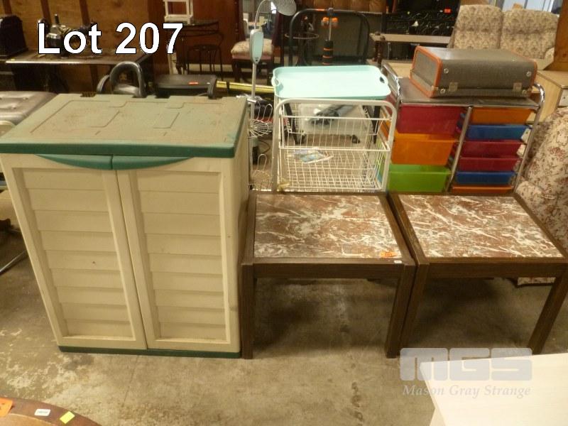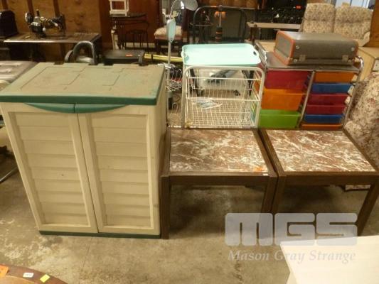 PAIR GRANITE TOP SIDE TABLES & PLASTIC CABINET