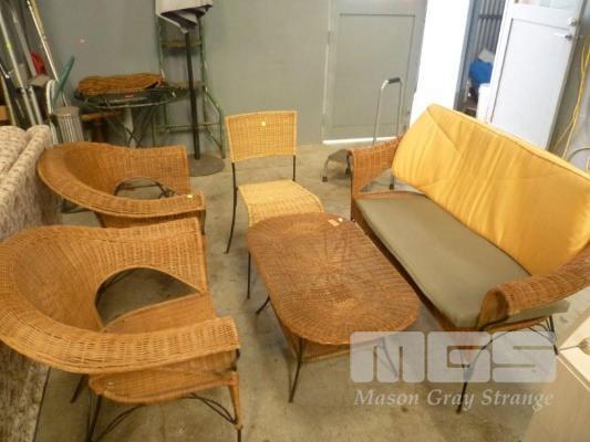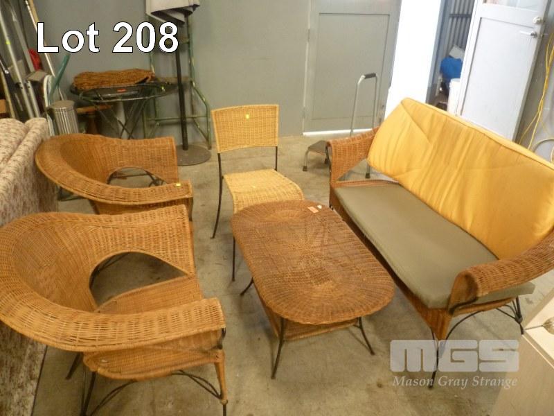 METAL FRAME, WICKER 5 PIECE PATIO SETTING INC 2 x SINGLES, 2 SEATER & COFFEE TABLE WITH WICKER CHAIR