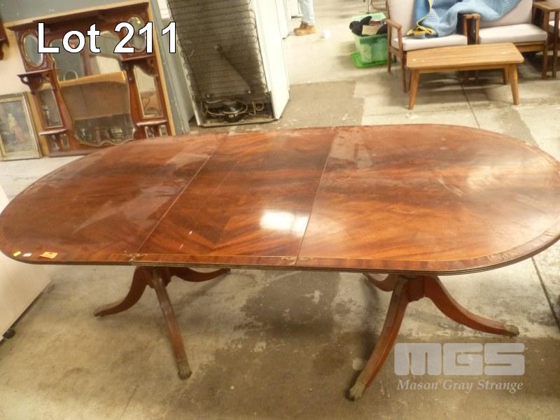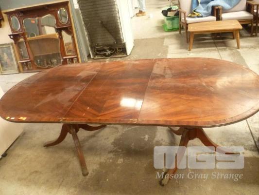 VINTAGE MAHOGANY OVAL EXTENSION TABLE, BRASS INLAYS, METAL CASTORS, BRONZE CLAW FEET, 2 x SINGLE PEDESTALS