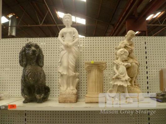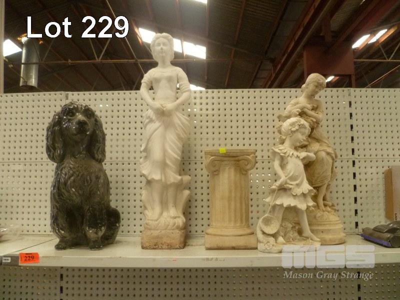 ASSORTED STATUES INC GLAZED DOG, PLASTER WOMAN, CONCRETE LADY & PLINTH & RESIN GIRL