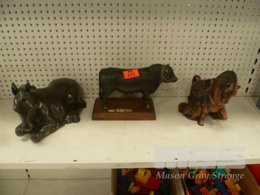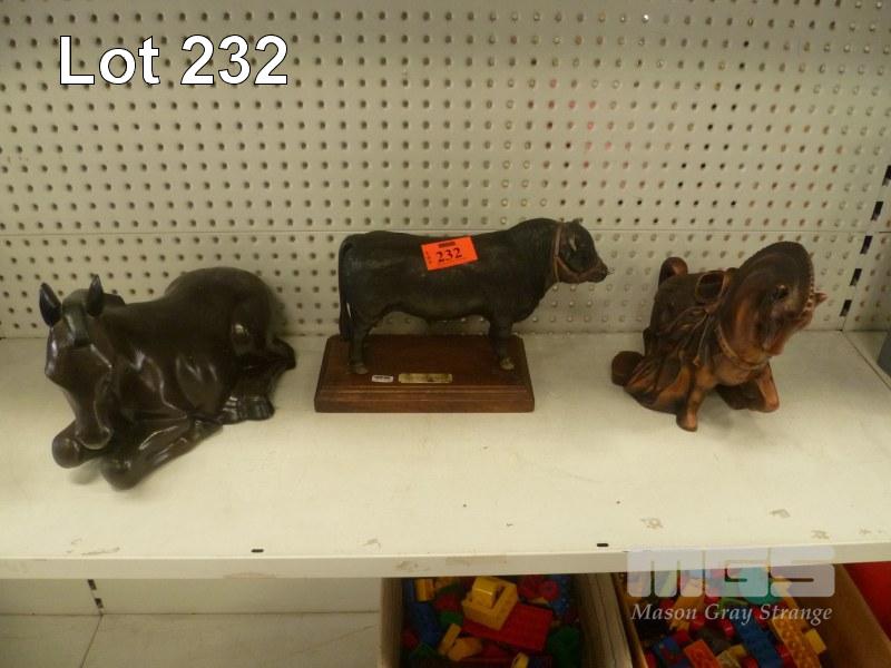 2 x CERAMIC HORSE STATUES & RESIN BULL