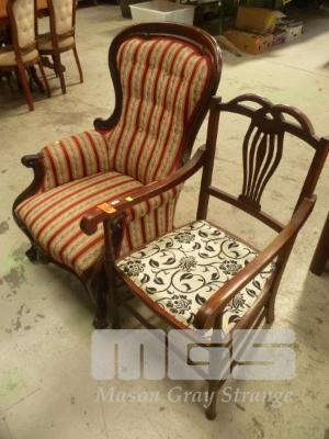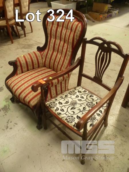 ORNATE TIMBER CARVED GRANDFATHER CHAIR, BURGUNDY/BEIGE PATTER FABRIC WITH TIMBER ARM CHAIR, DECORATIVE TIMBER