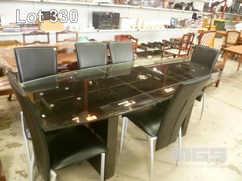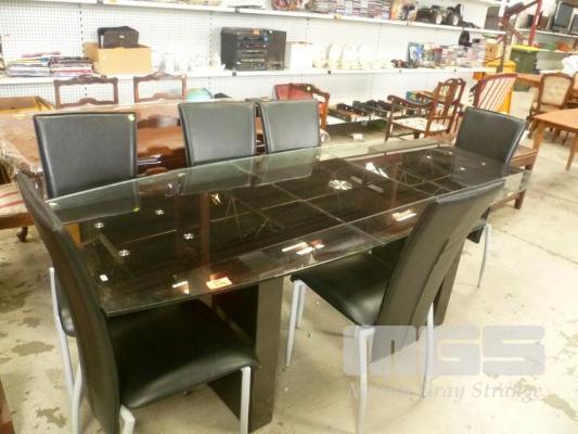 MODERN 7 PIECE DINING SUITE INC RECTANGULAR CURVED EDGE EXTENSION TABLE, THICK GLASS TOP, GRANITE LOOK, SLAB LEGS WITH BLACK VINYL HIGH BACK CHAIRS
