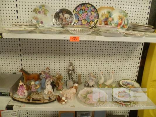 ASSORTED DISPLAY PLATES, ORNAMENTS & FIGURINES, 2 x SHELVES
