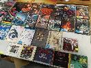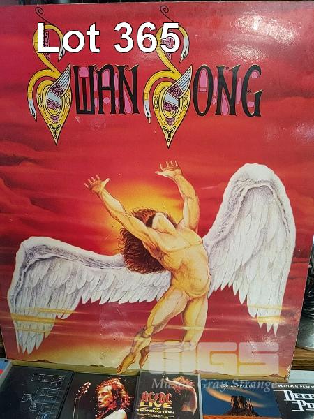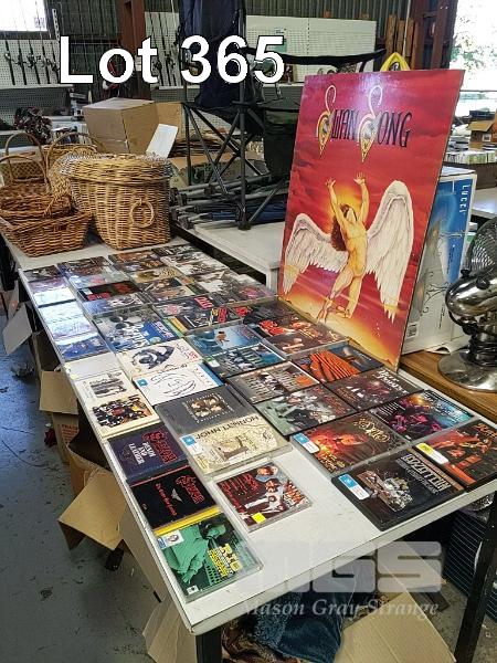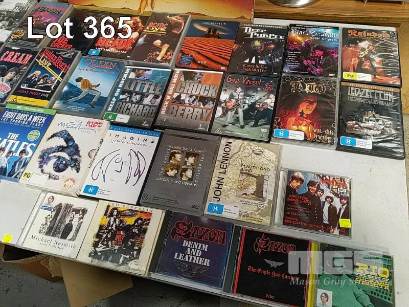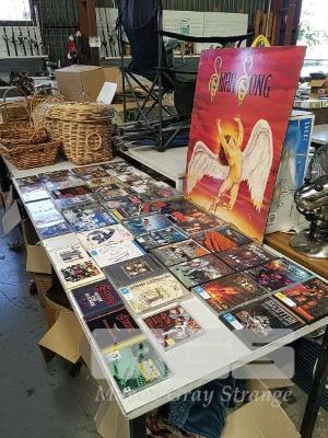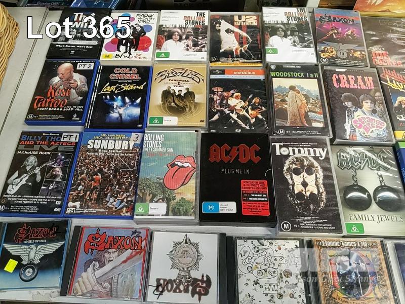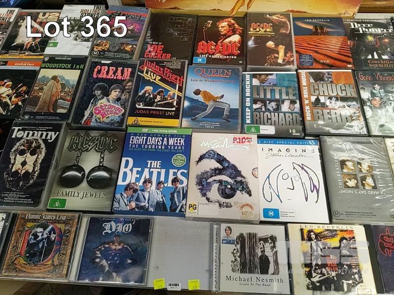 COLLECTION ASSORTED ROCK & ROLL VHS TAPES, DVDS AND CDS WITH BLOCK MOUNTED LED ZEPLIN "SWAN SONG" POSTER. INCLUDES AC DC, QUEEN, ROLLING STONES, BEATLES AND MUCH MUCH MORE