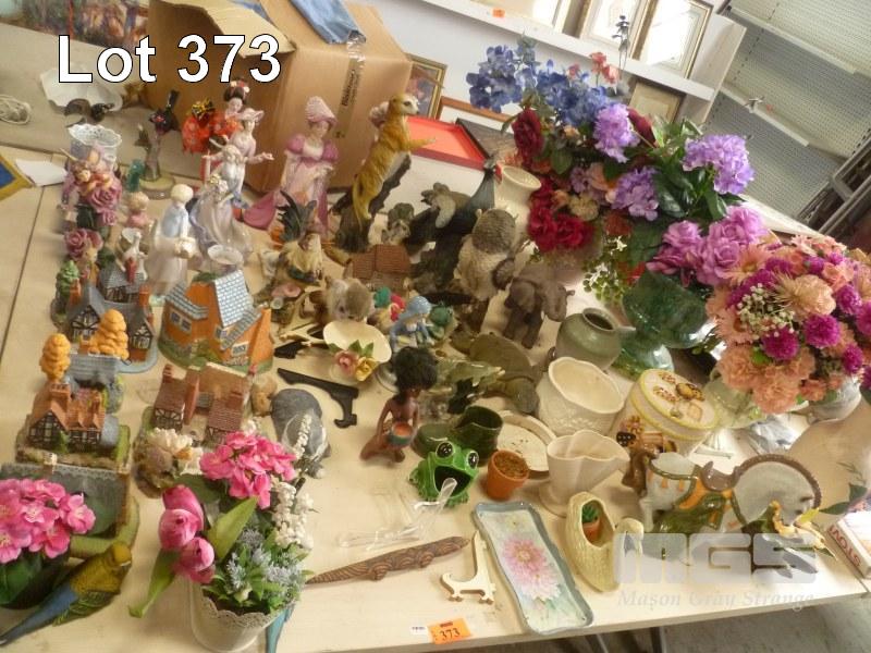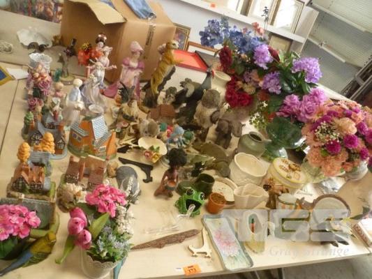 ASSORTED ORNAMENTS, FIGURINES, VASES, ARTIFICIAL PLANTS, ETC, 1 x TABLE