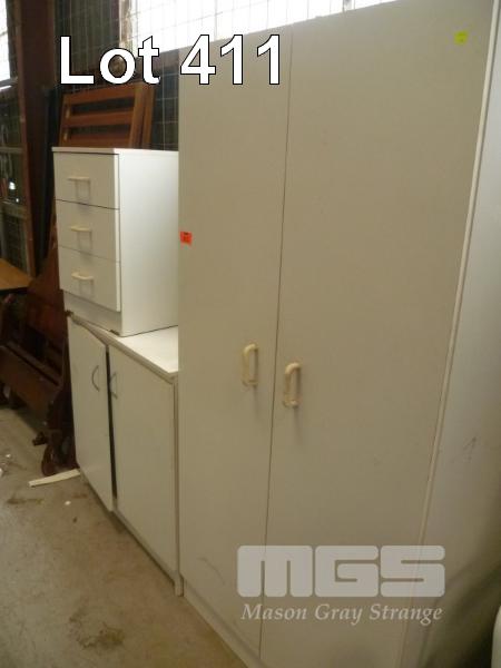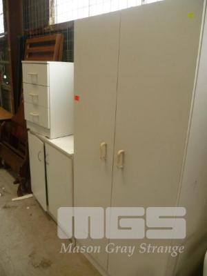 WHITE LAMINATE STORAGE CABINET, 2 DOOR WITH LOWLINE STORAGE CABINET & 3 DRAWER BEDSIDE