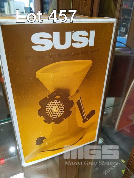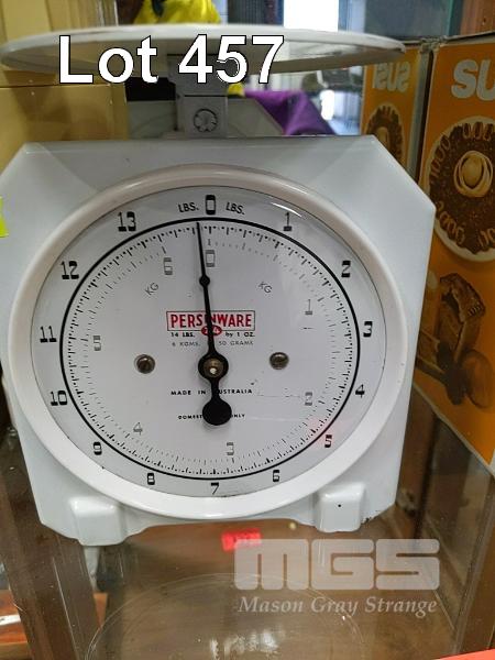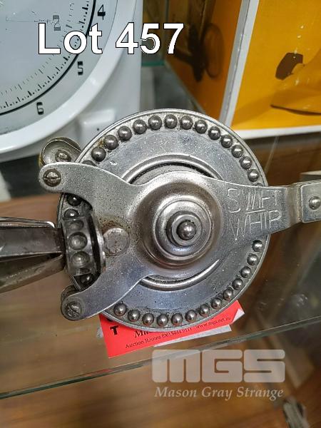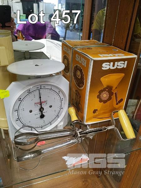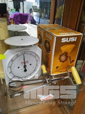 CLASSIC MID-CENTURY KITCHENWARE INCLUDING "SUSI" BENCHTOP MEAT-MINCER, "PERNSWARE" SCALES, THERMOS AND PATENTED BALL DRIVE "SWIFT WHIP" HAND MIXER