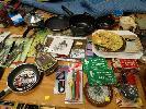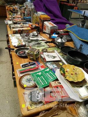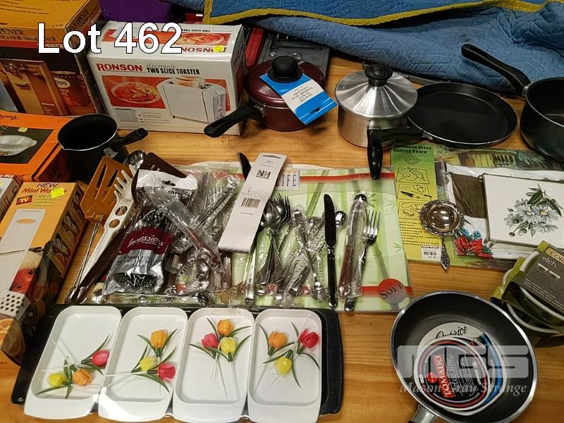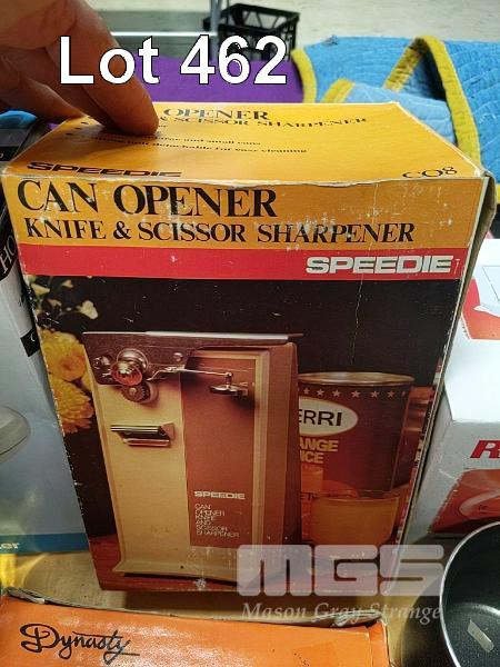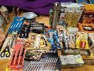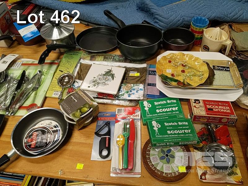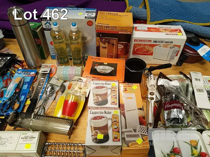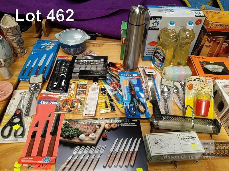 A COLLECTION OF KITCHENWARE, COOKWARE, FLATWARE, KNIVES, KITCHEN SCISSORS, KITCHEN ELECTRICAL AND MUCH MORE. INCLUDES CLASSIC "SPEEDIE" ELECTRIC CAN OPENER/SHARPENER (1 x TABLE).