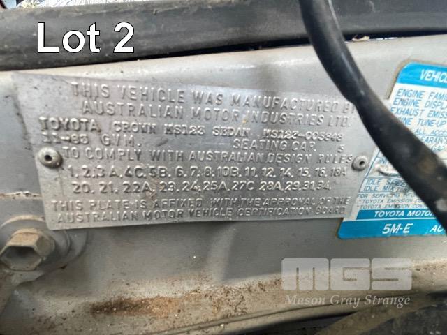 1983 TOYOTA CROWN ROYAL SALOON MS123 SEDAN REG: N/A VIN: M3123-005848 ODO: 183,1kms SHOWING 2.8L, 3 SPEED AUTOMATIC TRANSMISSION, PETROL, SILVER DUCO, 4 DOORS, 5 SEAT, RWD AIR CON, ALLOY WHEELS, CENTRAL LOCKING, POWER STEERING, POWER WINDOWS, SPARE WHEEL, CAR STARTS & RUNS, NEW BATTERY FITTED (WITH 1 KEY/S)