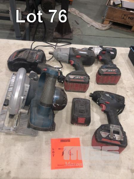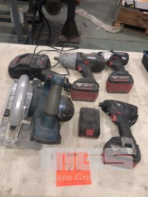 BOSCH CORDLESS TOOL SET, 18V INC IMPACT GUN, TEK GUN, DRILL, CHARGER & 5 x BATTERIES