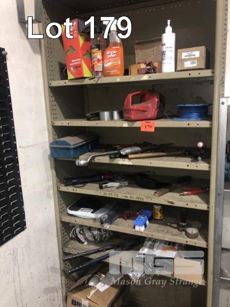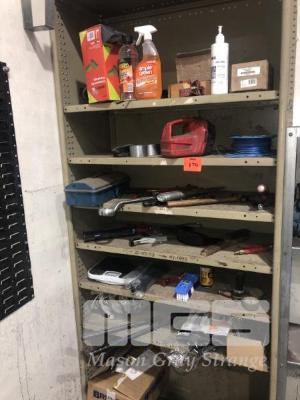 TOOLS, WIRE TIE, LONG HANDLE RIVET GUN, GLOVES, MASKS, ETC, CONTENTS 1 x SHELF