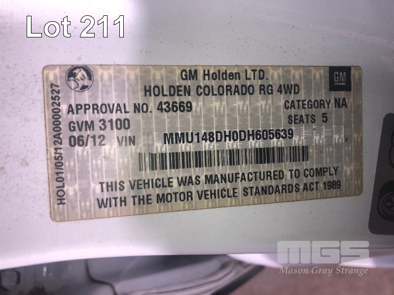 2012 (CP) HOLDEN COLORADO DUAL CAB UTILITY 4x4 REG: S065 AYF VIN: MMU148DH0DH605639 ODO: 193,425 kms SHOWING 2.8 CTDI, 5 SPEED MANUAL TRANSMISSION, DIESEL, WHITE DUCO, 4x4 TONNEAU COVER T.BAR (WITH PAPERS, WITH 1 KEY/S)