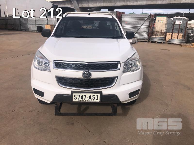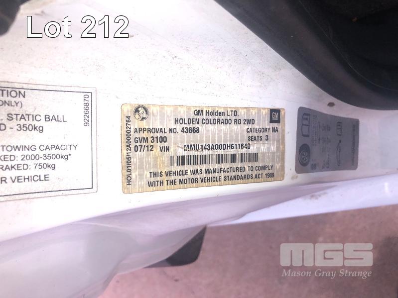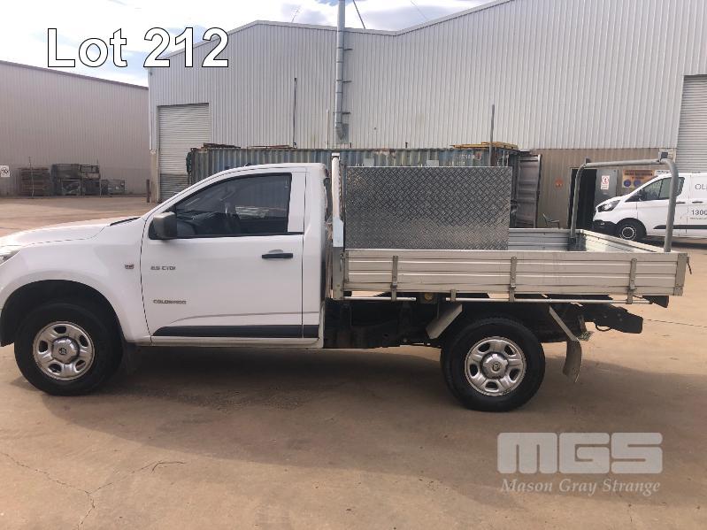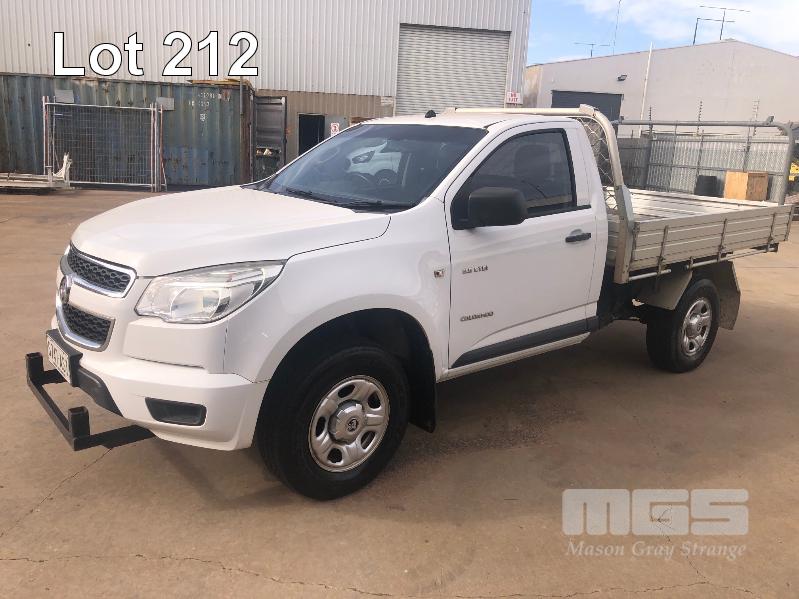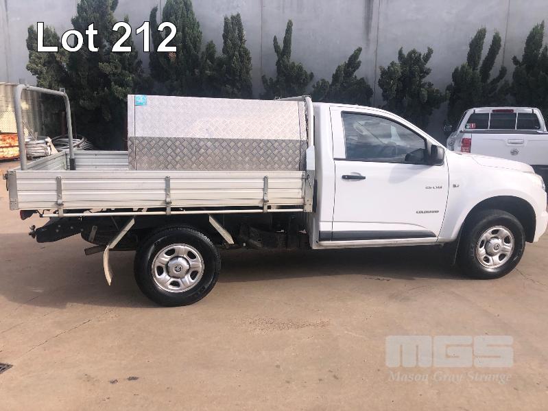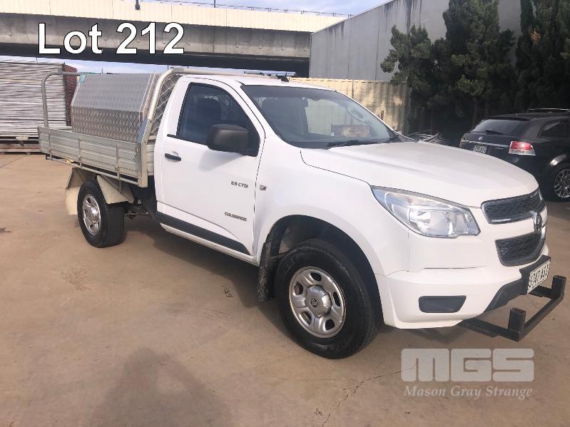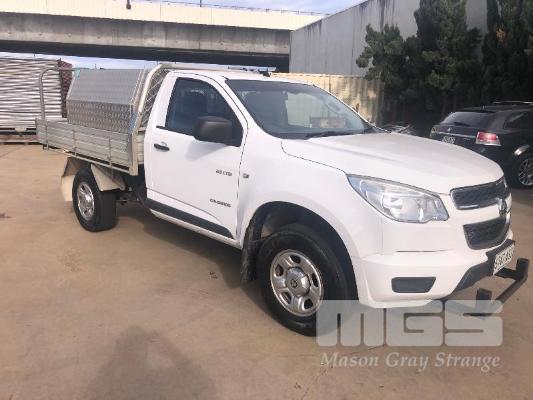 2012 (CP) HOLDEN COLORADO SINGLE CAB TRAYTOP UTILITY 4x2 REG: S747 ASI VIN: MMU143AG0DH611640 ODO: 62,944 kms SHOWING 2.5 CDTI, 5 SPEED MANUAL TRANSMISSION, DIESEL, WHITE DUCO, 4x2 AIR CON, POWER WINDOWS, TOW BAR, ALLOY DROP SIDE TRAY ALLOY TOOL BOX (WITH PAPERS, WITH 1 KEY/S)