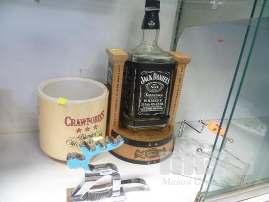 JACK DANIELS SWING ARM DECANTER, (EMPTY), CRAWFORDS ICE BUCKET, CHROME REINDEER NUTCRACKER & SERVIETTE HOLDER
