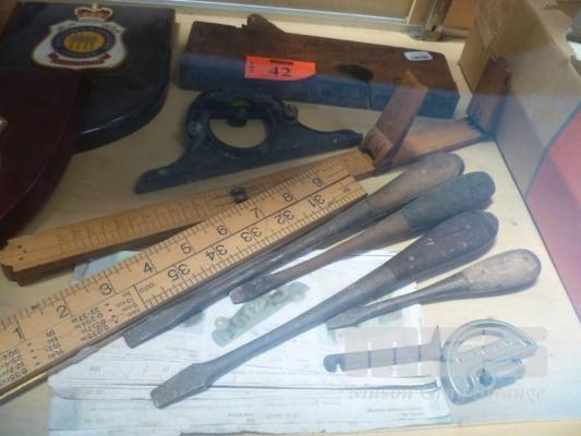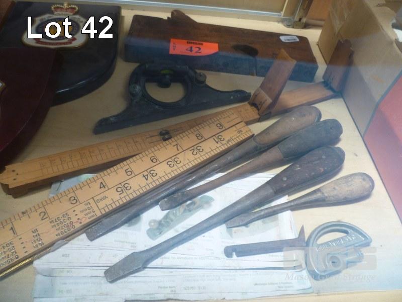 ANTIQUE WOODEN FOOT MEASURE & ASSORTED CARPENTERS TOOLS