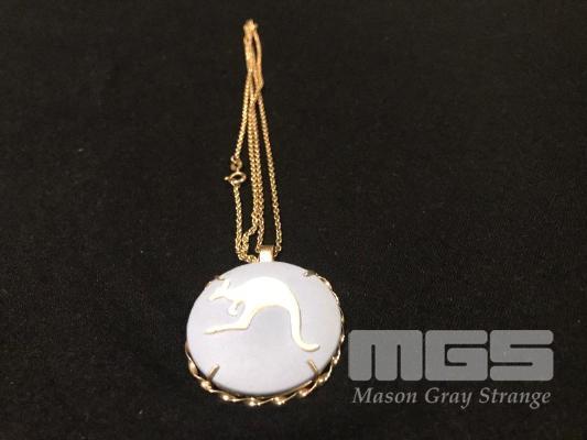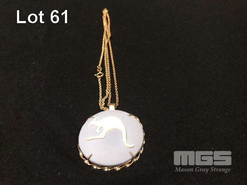 WEDGEWOOD CIRCULAR PENDANT, MADE IN ENGLAND, DEPICTING KANGAROO ON GOLD CHAIN MARKED 375 CHAIN WEIGHT 4.2 GMS TOTAL WEIGHT 10.5