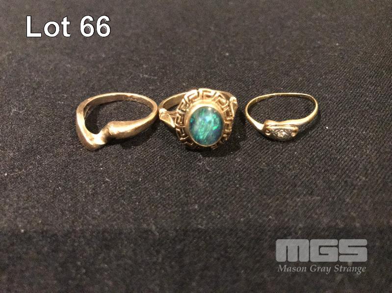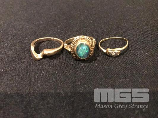 3 X GOLD RINGS, 1 X OPAL SETTING, 1 X SMALL DIAMOND SETTING, 1 X PLAIN