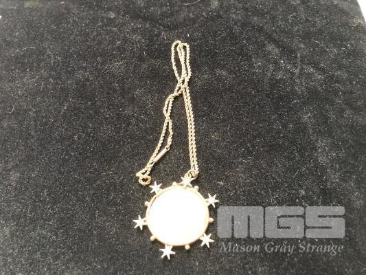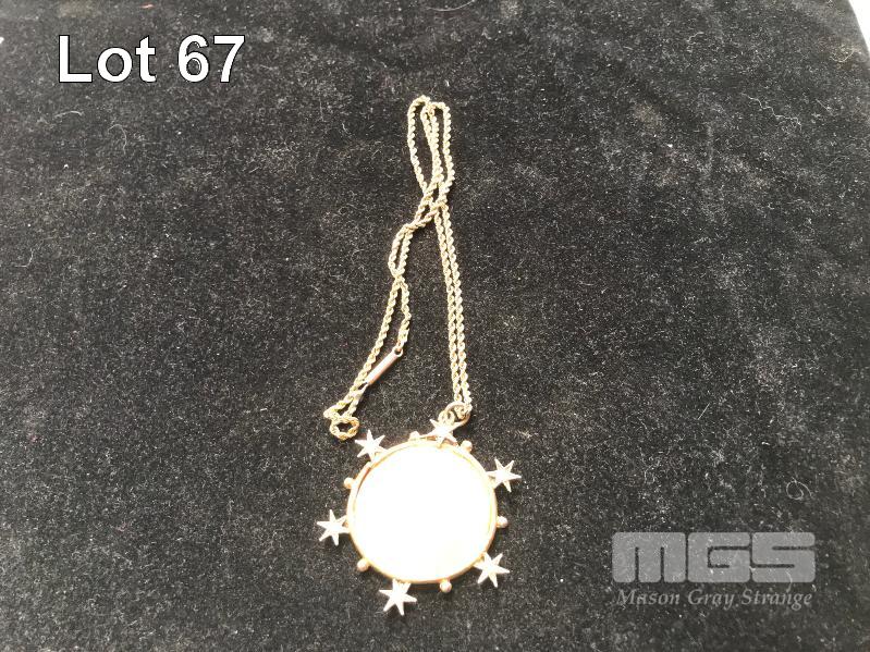 GOLD ROPE CHAIN MARKED 9 CT, GOLD RIMMED MOTHER OF PEARL PENDANT WITH STAR & PEARL FEATURES (UNMARKED) CHAIN WEIGHT 2.5 GMS, TOTAL WEIGHT 7.6 GMS