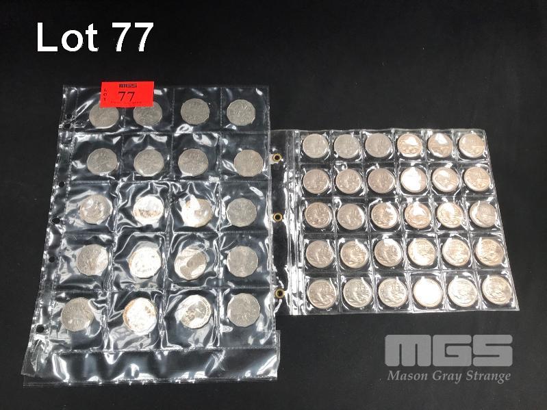 20 X COMMEMORATIVE 50 CENT COINS & 30 X EARLY 20 CENT COINS 1966 TO 1978
