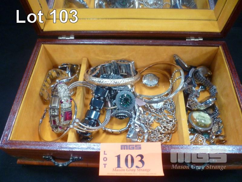 JEWELLERY BOX WITH ASSORTED DRESS JEWELLERY & WRIST WATCHES, INC; PERFEX, FEIWO, ISODORE, ETC
