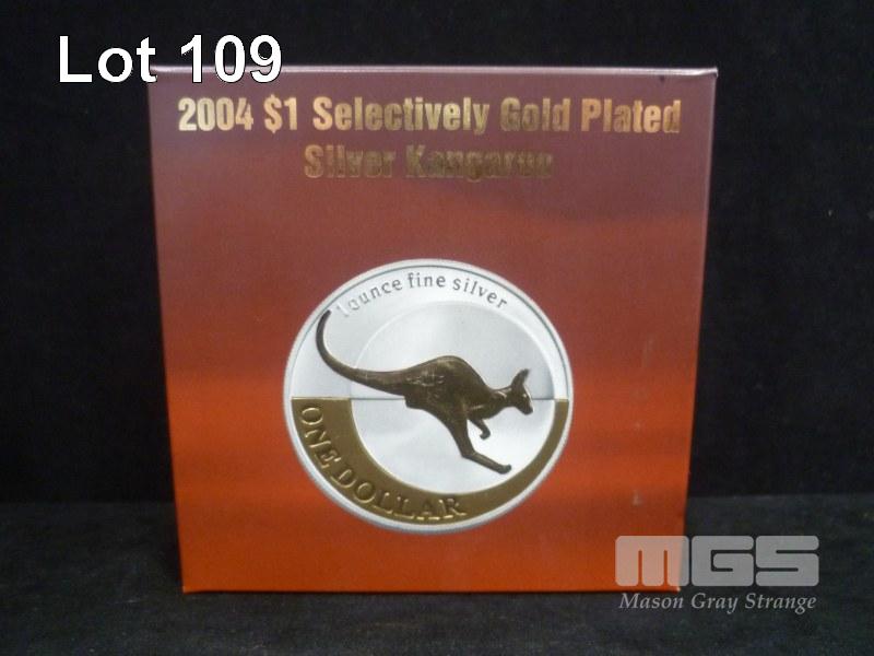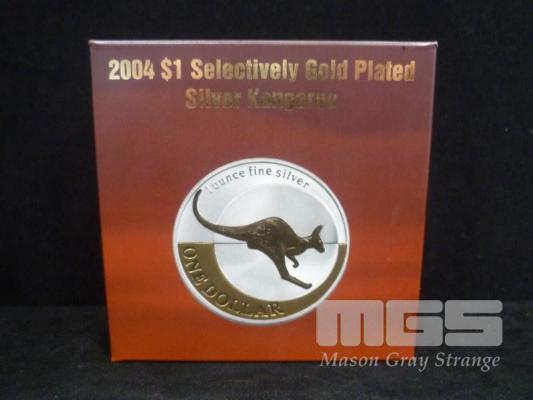 ROYAL AUSTRALIAN MINT, 2004, $1 SELECTIVELY GOLD PLATED SILVER KANGAROO, PROOF COIN, 1 TROY OUNCE, FINE SILVER (99.99%)
