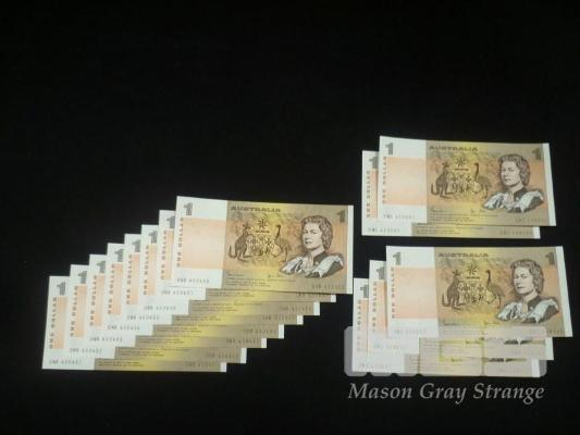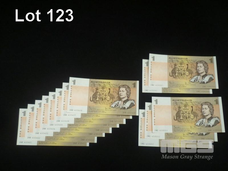 13 X AUSTRALIA, CONSECUTIVE BLOCKS OF 3, $1 PAPER BANKNOTES, JOHNSTON/STONE, INC; 2 X $1, DNS 450260-261, 3 X $1, DNS 450051-053, 8 X $1, DNR 450451-458