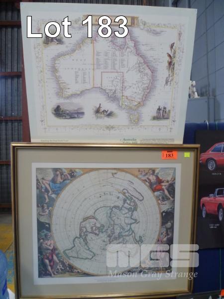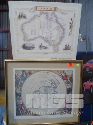 FRAMED REPRODUCTION ANTIQUE MAP OF WORLD "PLANISPHERE TERRESTRE" BY PIERRE VANDER CIRCA 1700 AND REPRODUCTION MAP OF AUSTRALIA "TALLIS 1851"